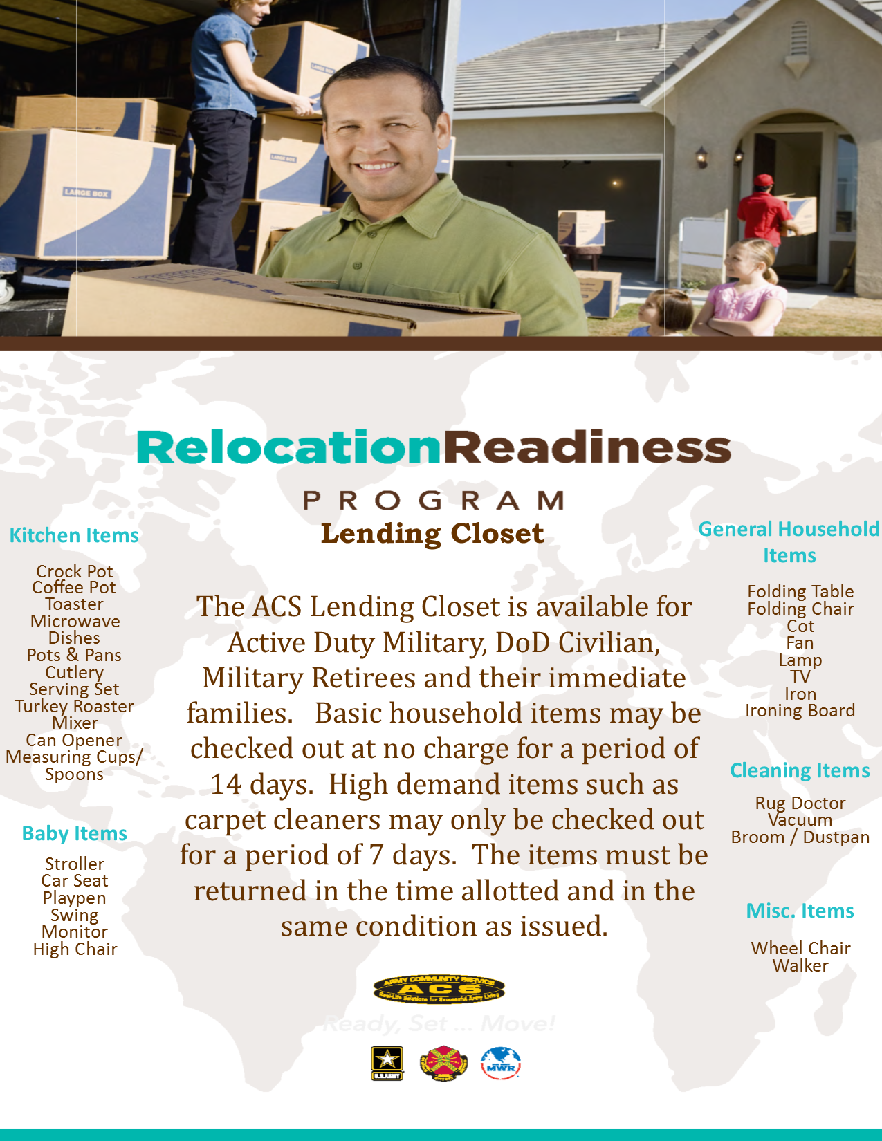 The ACS Lending Closet is available for Active Duty Military, DoD Civilian, Military Retirees and their immediate families. Basic household items may be checked out at no charge for a period of 14 days. High demand items such as carpet cleaners may only be checked out for a period of 7 days. The items must be returned in the allotted time and in the same condition as issued.
